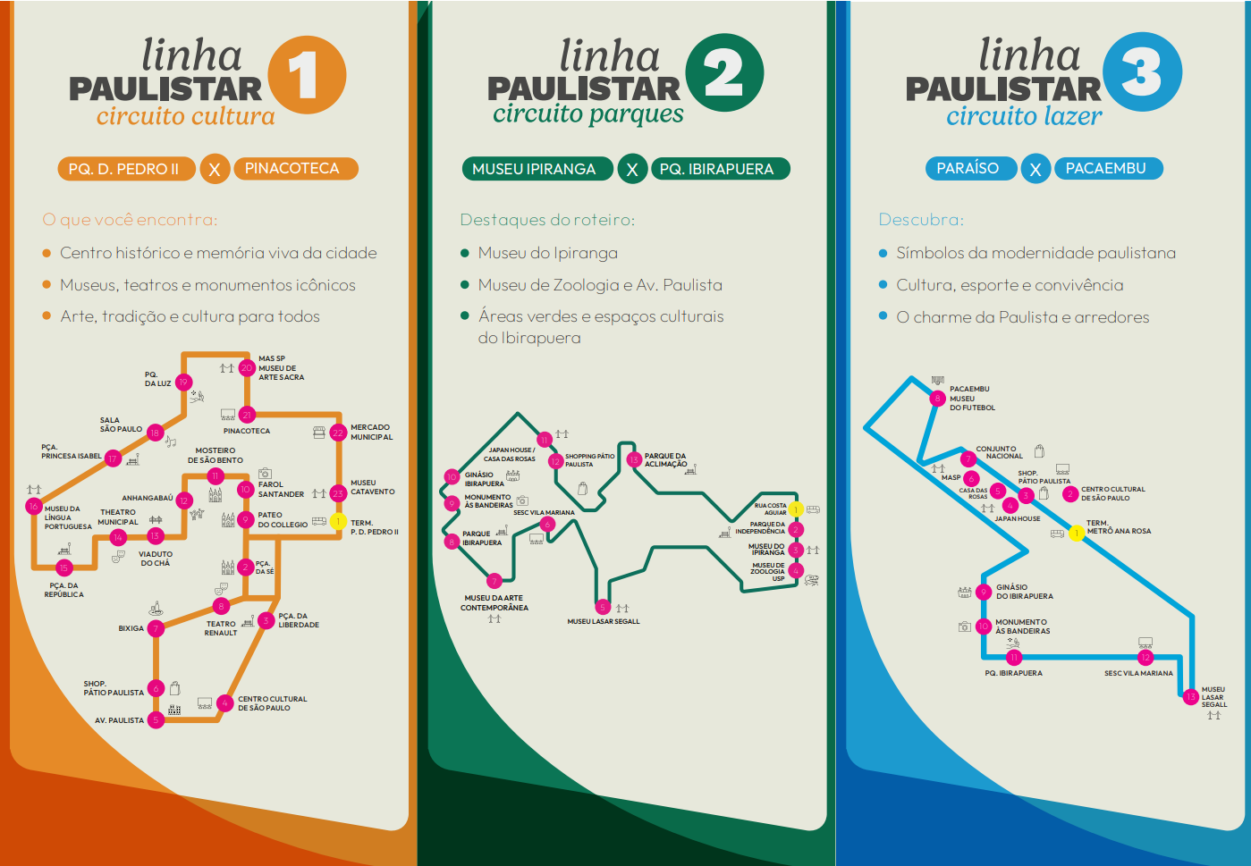 - Linha Paulistar 1 – Circuito Cultura: com início no Term. Parque D. Pedro II e indo até o Parque da Luz. Um passeio pela história de São Paulo, ligando a Estação da Luz e o Museu da Língua Portuguesa a pontos icônicos como o Mercadão, o Pateo do Collegio, o Theatro Municipal, a Pinacoteca, a Praça da República e os bairros da Liberdade e do Bixiga.