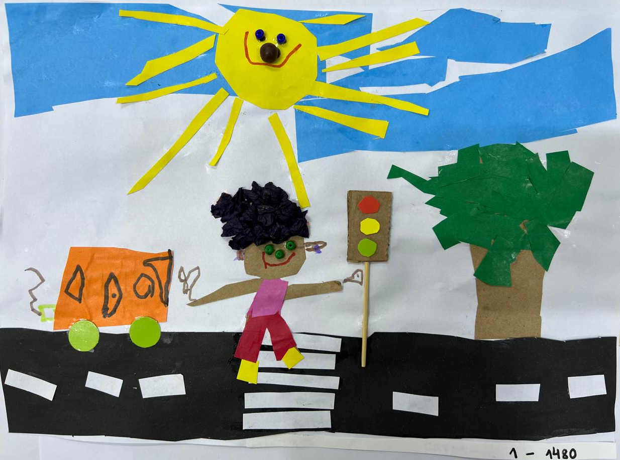 Na Educação Infantil, os pequenos Miguel Benedetti Lima, do CEI Baroneza de Limeira, e Amaia Emily Vega Valdivia, do CEI CEU Paz, criaram colagens que ilustram de forma lúdica e colorida a educação no trânsito, representando faixas de pedestre, sinais e situações do cotidiano que ajudam a construir hábitos seguros desde a primeira infância.