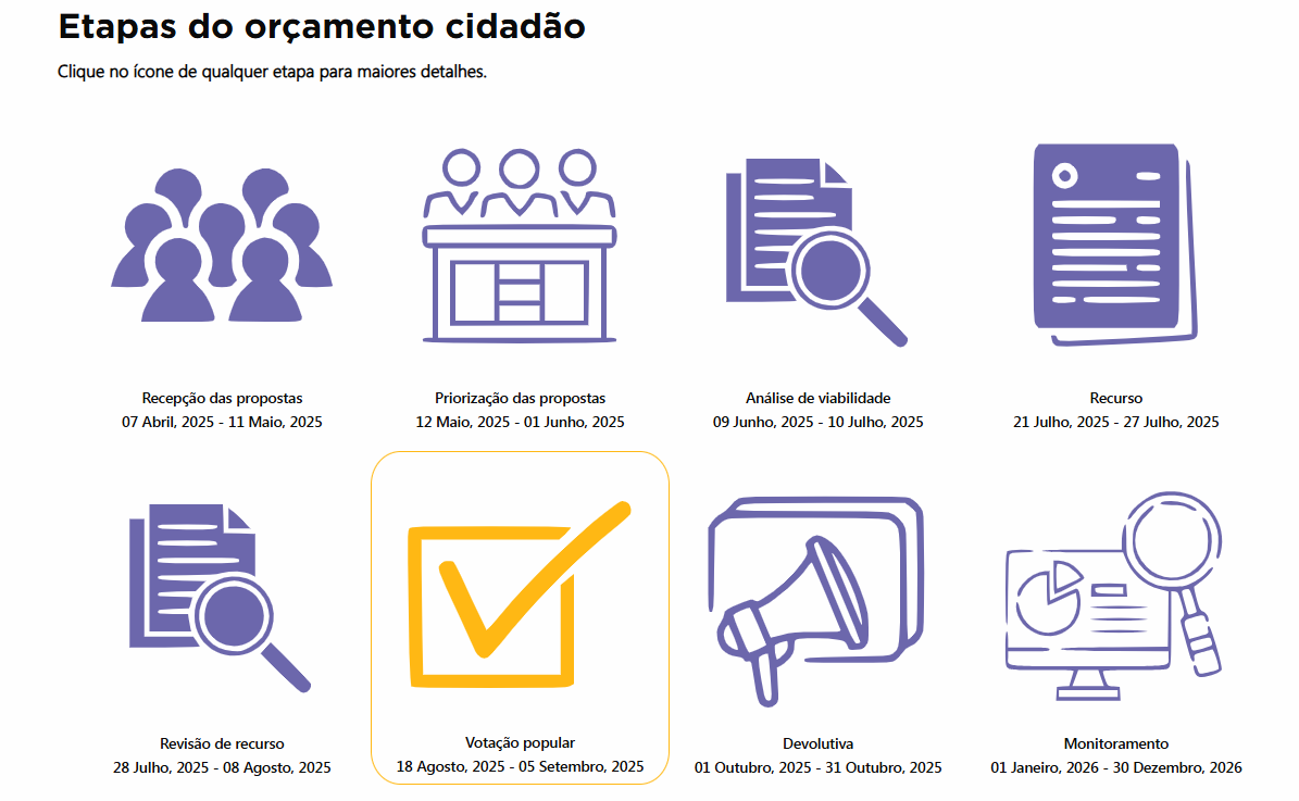 As propostas viáveis são submetidas à votação. Entre outubro e novembro, será ainda realizado o ciclo de audiências públicas devolutivas, online. Isso é, o cidadão pode ainda entender e contestar o porquê de sua proposta não ter sido contemplada. ´
