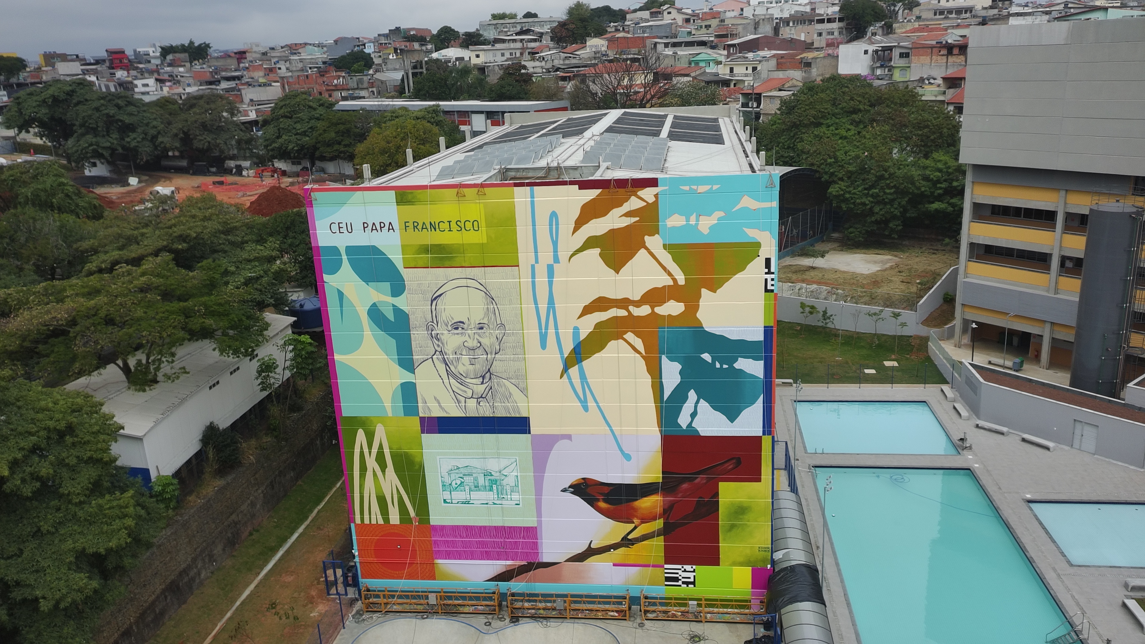 A obra utilizou tinta acrílica à base de água, com acabamento semi-brilho, aplicada com o auxílio de três balancinhos de seis metros. “Foi um grande projeto. Para mim, é sempre importante e satisfatório estar em um lugar que acolhe, educa e que forma pessoas. Foi uma honra fazer este trabalho”, disse o artista.