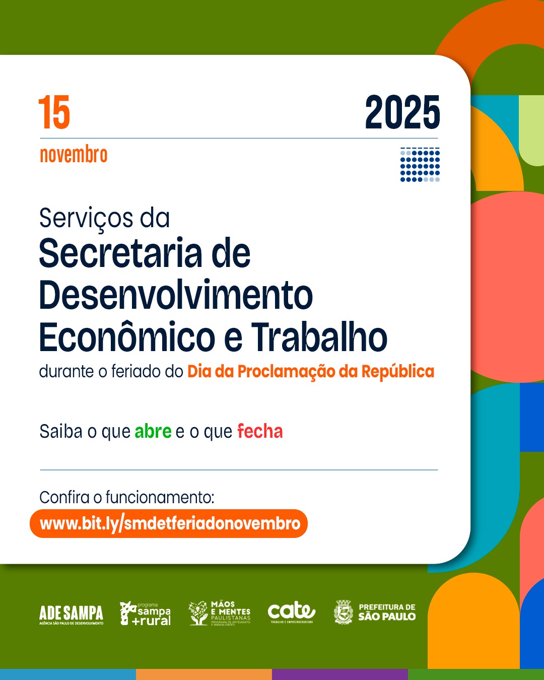 Em virtude do feriado nacional da Proclamação da República, celebrado em 15 de novembro, a Secretaria de Desenvolvimento Econômico e Trabalho da Prefeitura de São Paulo seguirá o disposto na Lei Federal nº 662/1949, alterada pela Lei nº 10.607/2002, disponibilizando apenas o atendimento do programa Mãos e Mentes Paulistanas, em pontos como o Mercado Municipal da Penha ou São Miguel Paulista, na zona leste. A data marca o momento histórico em que a República foi proclamada, encerrando o período monárquico no Brasil.