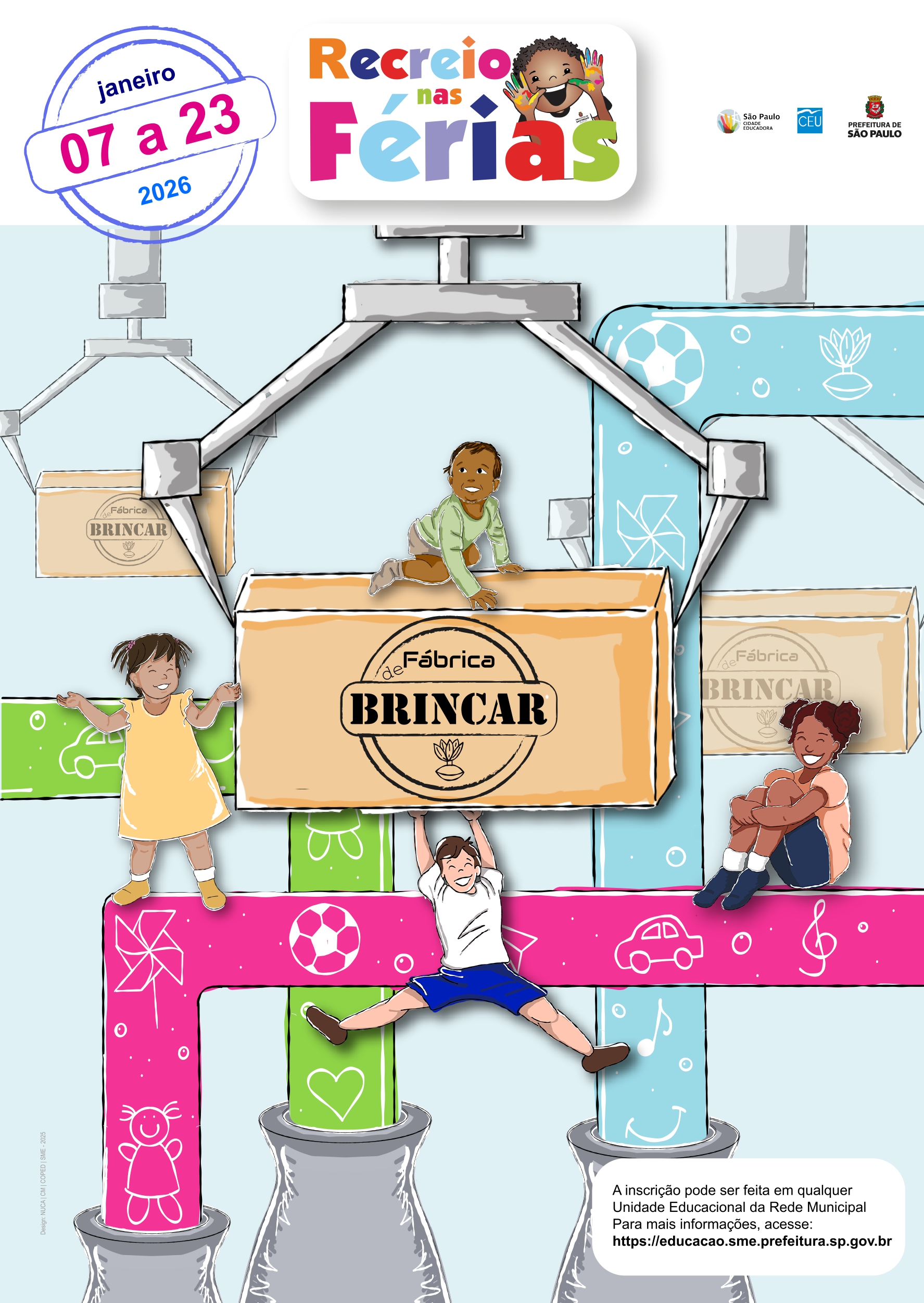 A Secretaria Municipal de Educação (SME), anuncia a abertura das inscrições para a 47ª edição do Programa Recreio nas Férias, um projeto consolidado que visa oferecer atividades lúdicas, culturais e educativas durante o recesso escolar. Com o tema “Fábrica de Brincar”, esta edição está programada para ocorrer no período de 07 a 23 de janeiro e destina-se a atender o público de 0 a 14 anos. A iniciativa prevê a participação de aproximadamente 53 mil crianças e adolescentes, distribuídos em 133 polos operacionais, que incluem CEUs, CECIs, CEIs, CEMEIs, EMEFs e EMEIs.