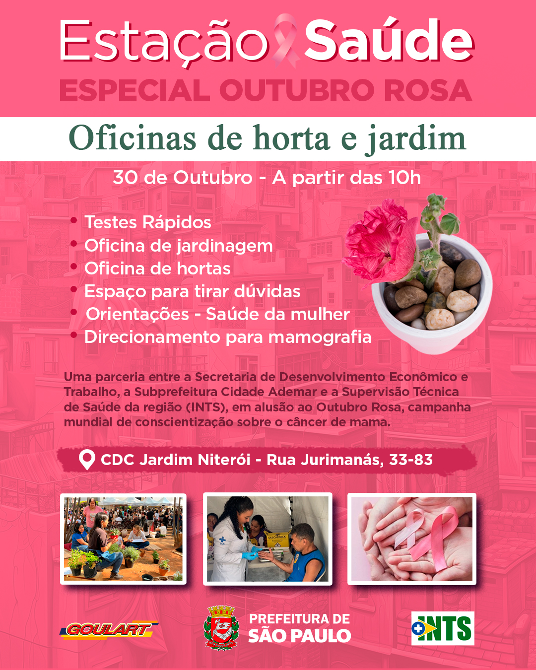 O Estação Saúde – Oficina Horta e Jardim é uma ação conjunta da Secretarias Municipais da Saúde e de Desenvolvimento Econômico e Trabalho, voltada à prevenção do câncer de mama e a promoção de hábitos sustentáveis. Com oficinas práticas de hortas caseiras e jardinagem, o evento também contará com testes rápidos de saúde, orientações sobre saúde da mulher, direcionamento para mamografias, bate-papo com profissionais, e muito mais — tudo com o apoio das equipes da UBS Jardim Niterói, da Subprefeitura, agentes comunitários de saúde e agentes de promoção ambiental.