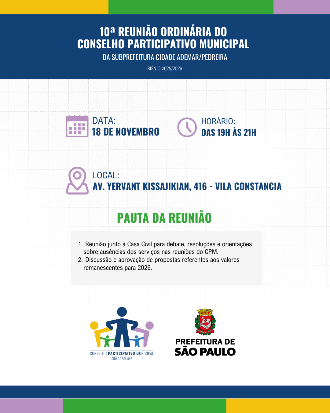 O Coordenador do Conselho Participativo Municipal de Cidade Ademar – Clóvis Rodrigues Ferreira, no uso de suas atribuições, convoca todos os conselheiros (as) deste conselho, e demais interessados, para a 10ª reunião ordinária que acontecerá presencialmente no auditório da Subprefeitura de Cidade Ademar, sito Av. Yervant Kissajikian, 416 - Vila Constância. São Paulo, no dia 18 de Novembro de 2025, terça-feira, as 18: 30h, momento da primeira chamada, e às 19:00h segunda chamada, encerrando às 21h, tendo como pauta do dia: