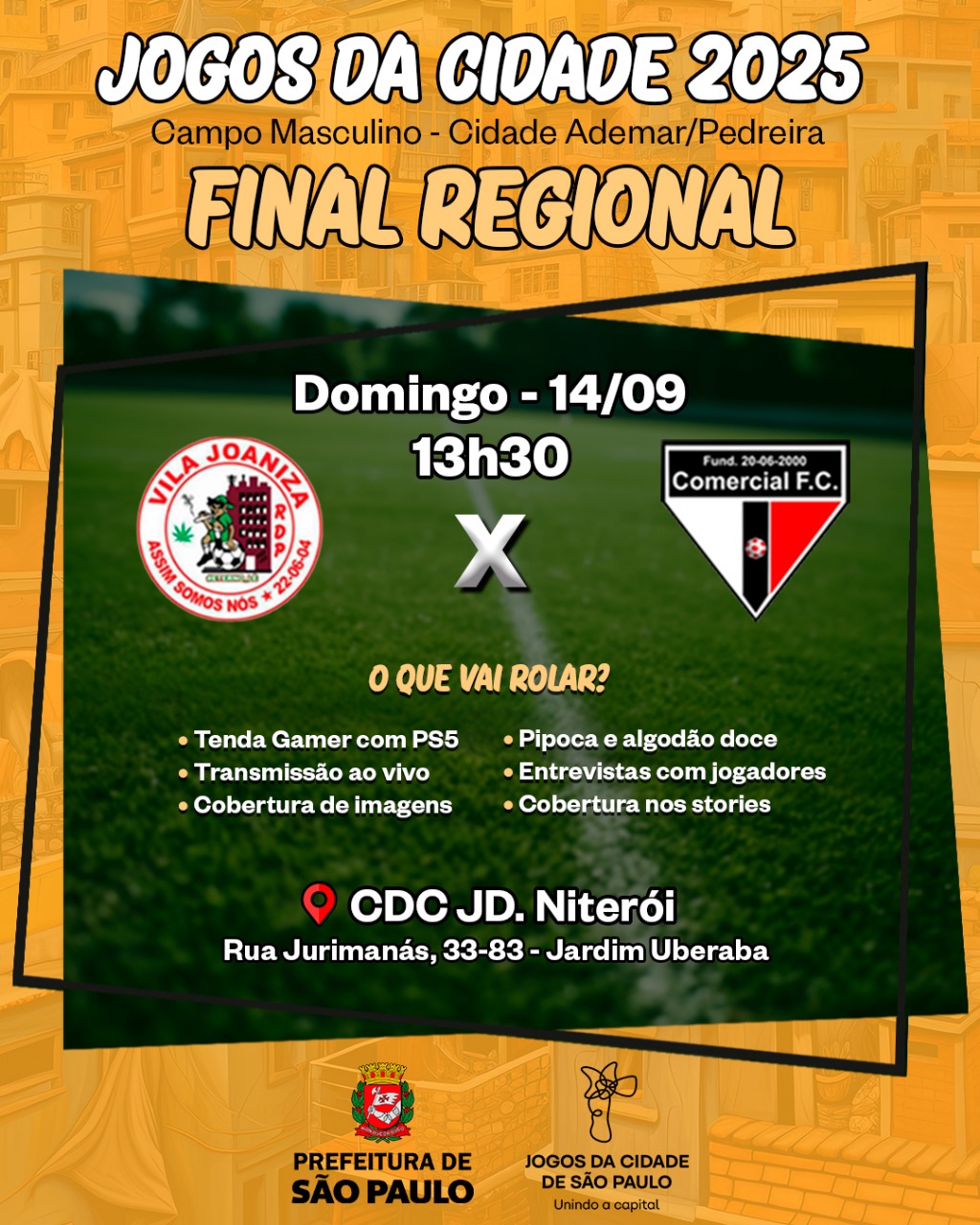 No dia 14 de Setembro (domingo), o campo do CDC Niterói será palco de grandes emoções com as partidas finais da etapa regional dos Jogos da Cidade 2025. Times tradicionais de Cidade Ademar e Pedreira se enfrentam em confrontos decisivos.