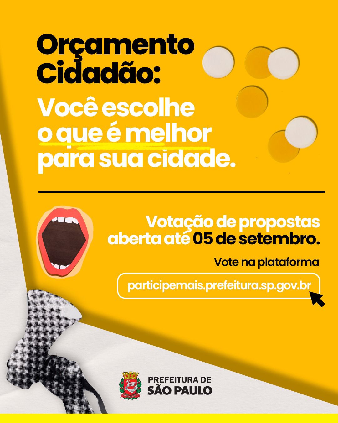 A etapa de votação para o Orçamento Cidadão 2026 da Prefeitura de São Paulo começa nesta segunda (18) e vai até 5 de setembro. Esse é o maior processo de participação social na elaboração de um orçamento público do país com a possibilidade de voto para qualquer cidadão. Para votar em até cinco propostas para o bairro, distrito ou subprefeitura da capital, o cidadão deve acessar a plataforma de consulta popular da Prefeitura – www.participemais.prefeitura.sp.gov.br.