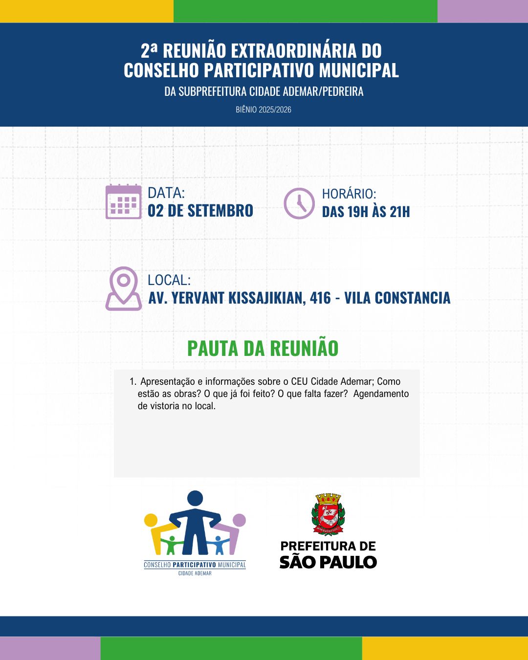 Veja os detalhes da 2ª reunião extraordinária do Conselho Participativo Municipal Cidade Ademar/Pedreira 💛