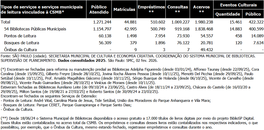 As informações se referem às unidades subordinadas diretamente à Coordenadoria do Sistema Municipal de Bibliotecas. Os dados divulgados no período de 2009 a 2016 são referentes à 51 Bibliotecas Públicas de Bairro, Biblioteca Infantojuvenil Monteiro Lobato, 15 Pontos de Leitura, 13 Bosques da Leitura e 12 Roteiros alternados semanalmente do Ônibus-Biblioteca, além de dados da Feira de Troca de Livros e Gibis. A partir de 2017, a Biblioteca Jayme Cortez do Centro Cultural da Juventude e a Biblioteca José Paulo Paes do Centro Cultural da Penha passam a fazer parte do conjunto de bibliotecas de CSMB, conforme decreto 57.528 de 12 de dezembro de 2016, e seus dados passam a ser coletados, organizados e divulgados em conjunto, totalizando 54 bibliotecas.