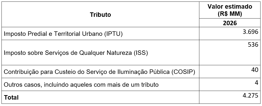 Para o exercício de 2026, foi estimado no âmbito do município de São Paulo cerca de R$ 43,9 bilhões para as renúncias de receitas tributárias, imunidades constitucionais e benefícios financeiros e creditícios, distribuídos conforme a tabela abaixo:
