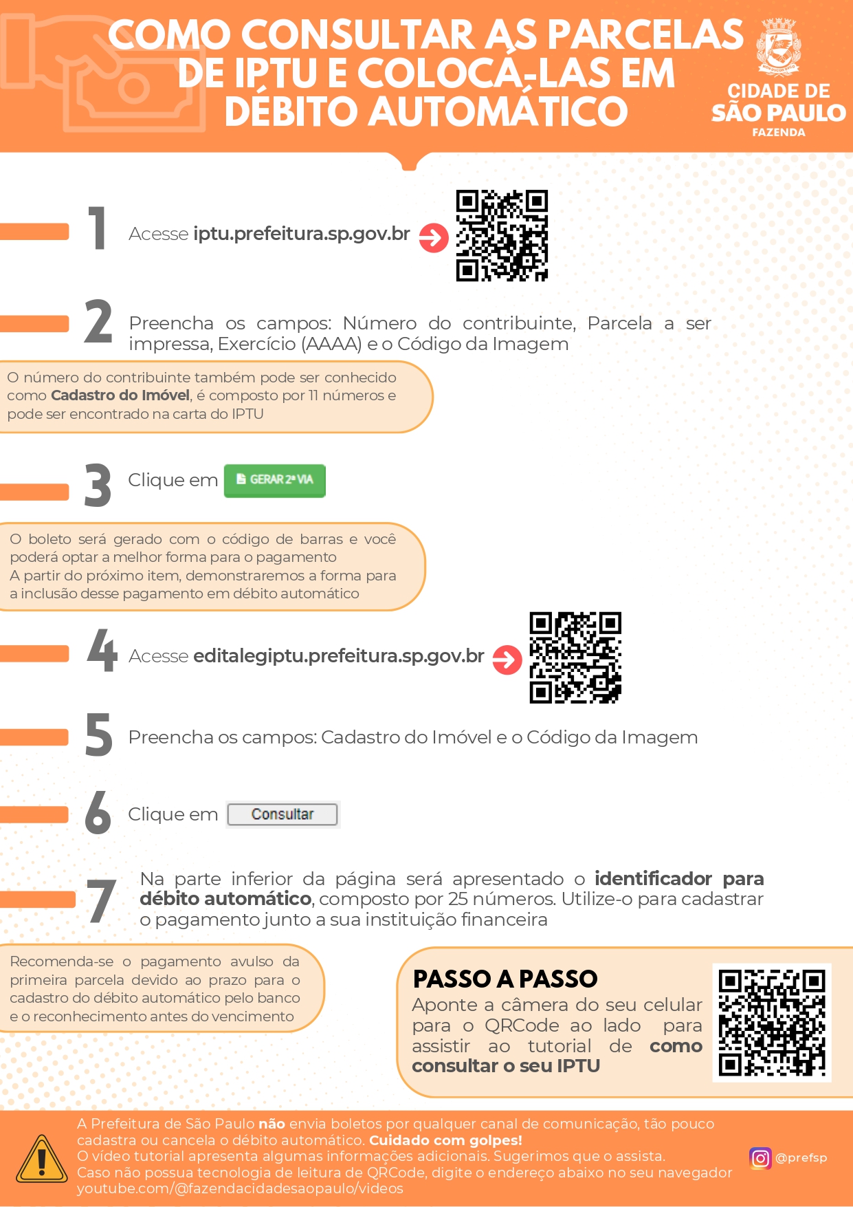 - Sem necessidade de boletos, para os bancos que têm opção de Pagamento Online mediante o fornecimento do número do cadastro do imóvel (também conhecido como número do contribuinte ou SQL) - a forma de acesso varia de banco para banco, mas normalmente devem ser selecionadas as opções de pagamentos sem código de barras e/ou tributos municipais. Essa modalidade pode ser utilizada: