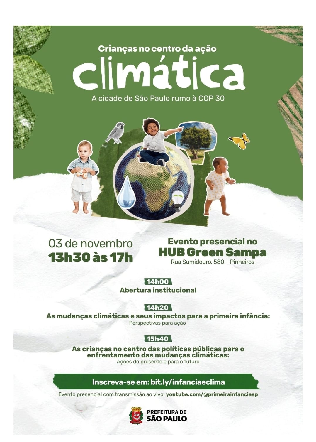 Como atividade preparatória deste momento, no dia 3 de novembro, das 13h30 às 17h, a Prefeitura de São Paulo realizará o evento “Crianças no centro da ação climática: a cidade de São Paulo rumo à COP 30”, com o intuito de discutir os impactos das mudanças climáticas nas infâncias e ações da cidade visando o seu enfrentamento. O encontro proposto para agentes públicos municipais e para a sociedade civil contará com uma abertura institucional, seguida da mesa “As mudanças climáticas e seus impactos para a primeira infância” com mediação da Residente em Gestão Pública da SECLIMA, Camila da Costa Moreira, e com a presença das especialistas Sofia Antonelli (Instituto Alana), Marieta Colucci (CECIP/Urban95) e Ludmila Amorim (SECLIMA) como convidadas para tratarem dos impactos das mudanças climáticas na infância e dos movimentos que fortalecem as ações de enfrentamento deste fenômeno, como a COP30 e diversas outras ações locais.