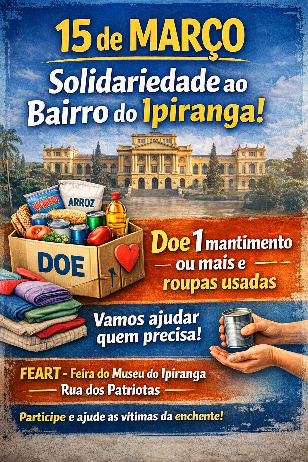A FEART, Feira de Artesanato, Gastronomia e Antiguidades, realizará, no próximo dia 15 de março, uma ação solidária de arrecadação de mantimentos e roupas usadas para auxiliar famílias afetadas pela enchente ocorrida no bairro do Ipiranga no dia 8 de março.