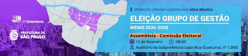 A Prefeitura de São Paulo, por meio da Secretaria Municipal de Urbanismo e Licenciamento (SMUL) e da São Paulo Urbanismo, realiza no próximo dia 12 de fevereiro, às 18h30, uma assembleia pública para eleger a Comissão Eleitoral responsável por definir as regras e conduzir todo o processo eleitoral do Grupo de Gestão da Operação Urbana Consorciada Água Branca para o biênio 2026–2028. O encontro acontecerá no Auditório da Subprefeitura da Lapa, localizado na Rua Guaicurus, nº 1.000.