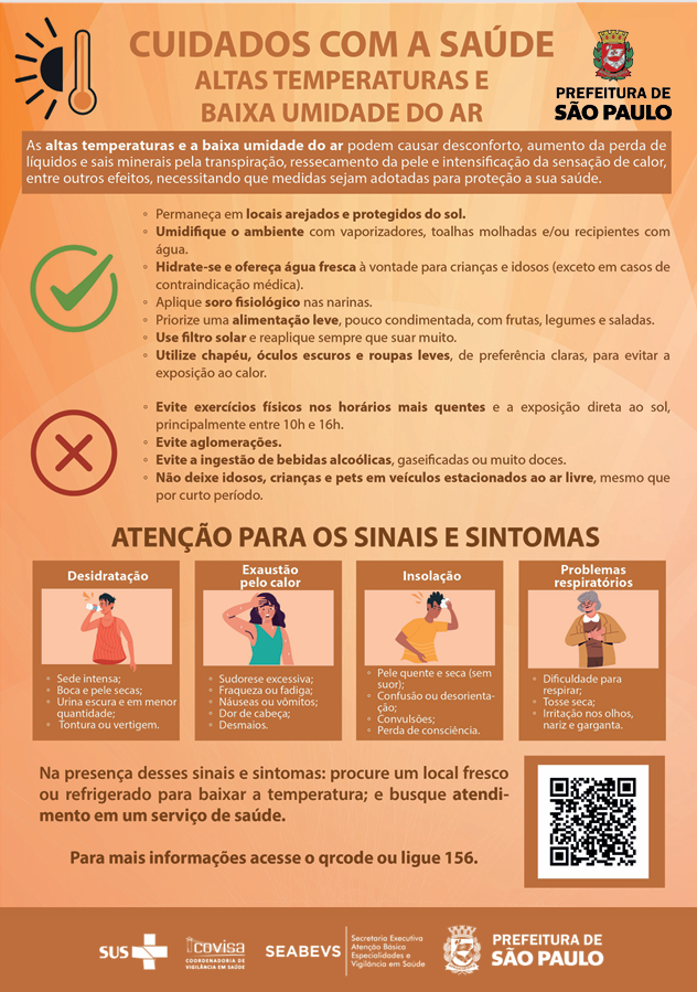 Estes documentos técnicos foram elaborados pela Secretaria Executiva de Atenção Básica, Especialidades e Vigilância em Saúde (SEABEVS), por meio da Coordenadoria de Vigilância em Saúde (COVISA) e da Coordenadoria de Atenção Básica (CAB), no âmbito da Secretaria Municipal de Saúde (SMS), com o objetivo de fornecer as principais orientações de saúde, tendo como foco a pessoa idosa e foco no ambiente escolar durante períodos de altas temperaturas e baixa umidade do ar.