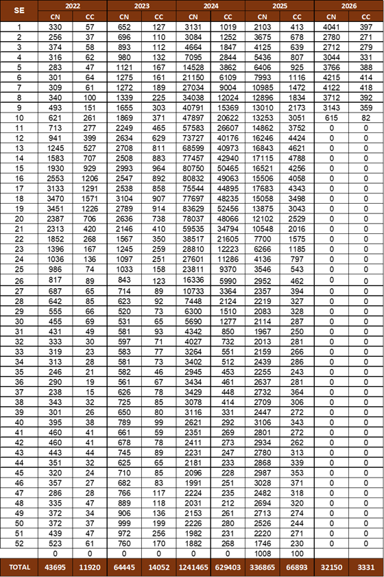 Casos notificados (CN) e confirmados (CC) de dengue, entre residentes no Município de São Paulo, segundo semana epidemiológica de início de sintomas (SE) e ano de início de sintomas. 2022 a 2026