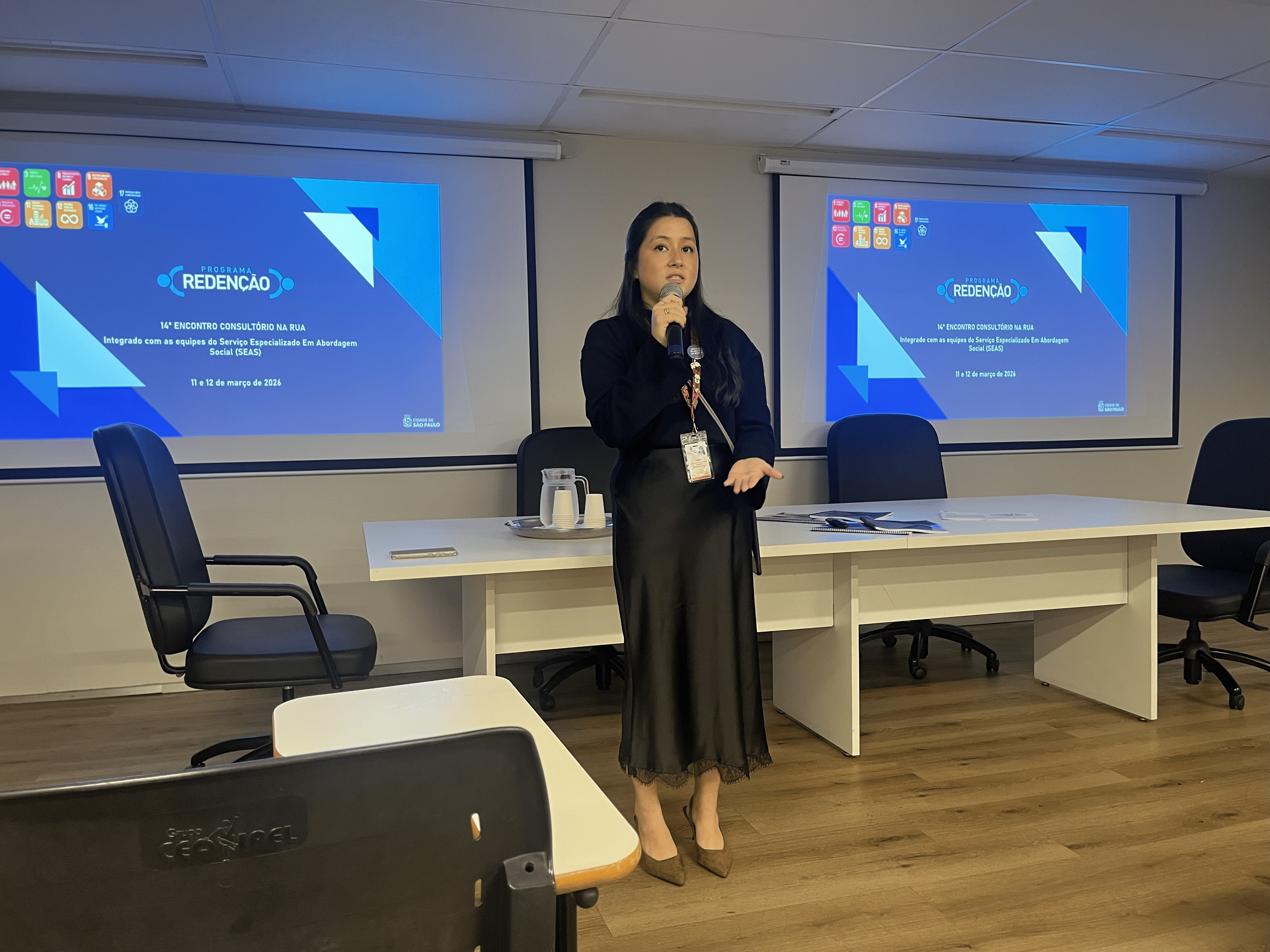 O encontro seguiu com a Coordenadora do Programa Redenção, Luiza Chizue Gatti Murakami, que apresentou uma análise das abordagens realizadas pelas equipes da Saúde e Assistência Social, incluindo o perfil das pessoas em situação de vulnerabilidade que foram abordadas pelos agentes. “A superação da situação de rua é uma responsabilidade do poder público e dos seus agentes, que têm o papel de trabalhar com as pessoas que estão em extrema vulnerabilidade para que elas possam sair dessa situação, além de garantir os direitos e a proteção social a esses indivíduos”, ressaltou Luiza durante a apresentação.