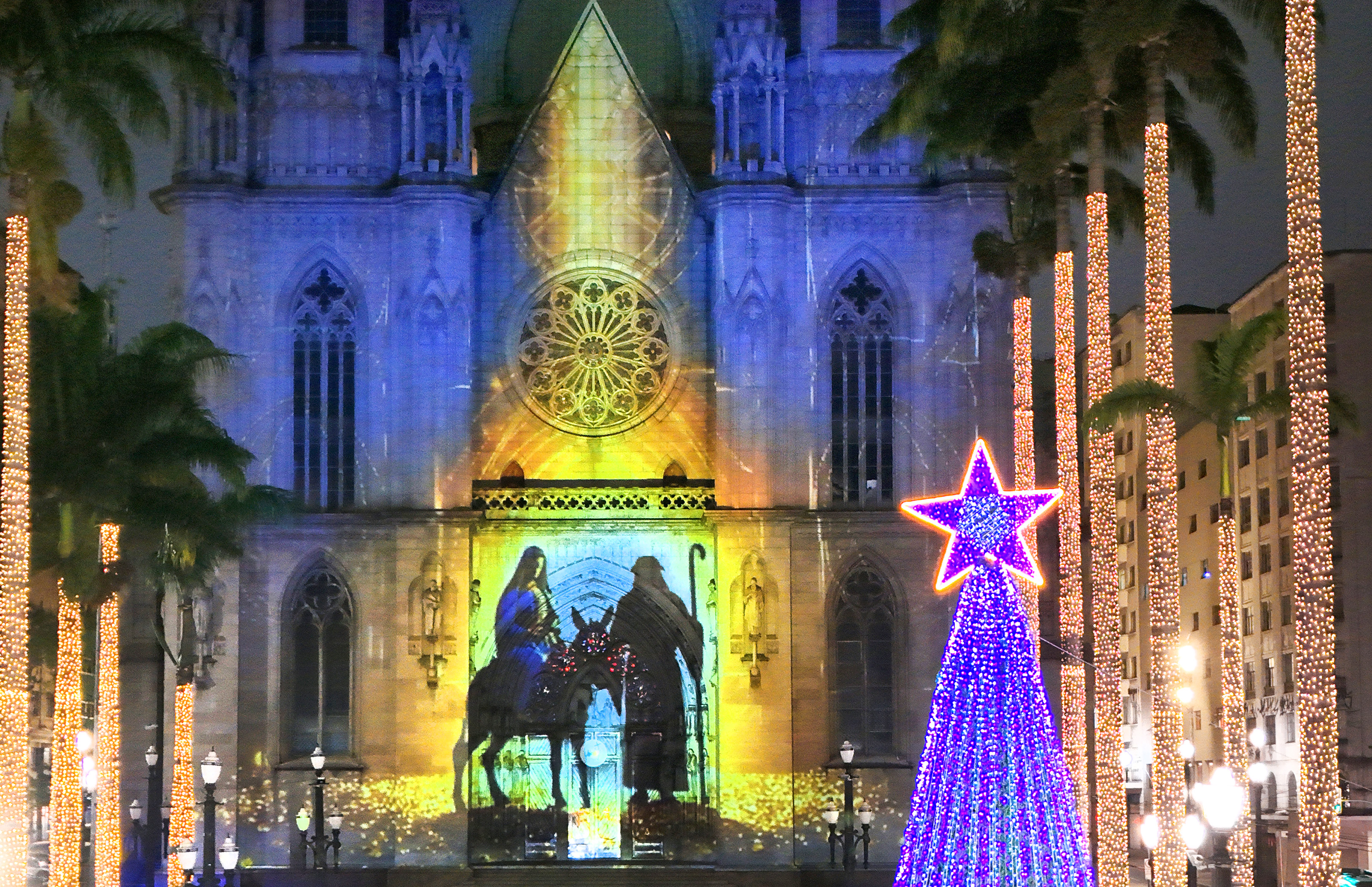 Em cerimônia embalada pelo Coral Baccarelli na Catedral da Sé, o prefeito Ricardo Nunes iniciou oficialmente nesta quinta-feira (27) o Natal Iluminado 2025, acendendo as luzes da árvore de Natal e das palmeiras imperiais da praça. A fachada da igreja ganhou projeções dos Três Reis Magos e dos pais de Jesus Cristo, Maria e José, além de mensagens de boas festas.