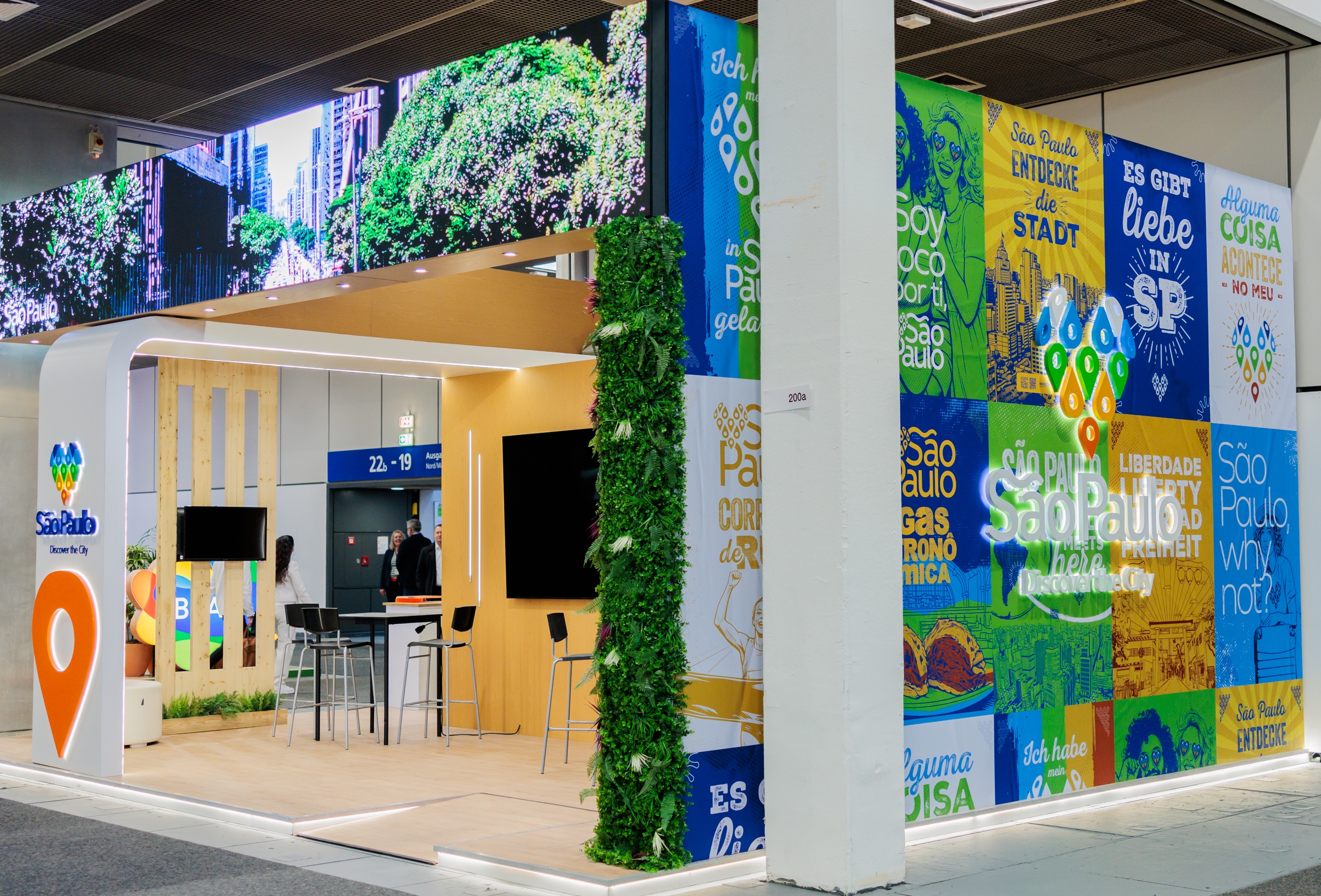 No estande da cidade, que tem 54 metros quadrados, por meio do programa Discover/Descubra São Paulo, participam sete empresas: Acangatá Filmes, Vivalá - Turismo Sustentável no Brasil, Mercado SP - Mercadão, IURD - Jardim Bíblico do Templo de Salomão, Five Transportes, Lina - Plataforma de Inteligência Artificial e Feel Sampa.