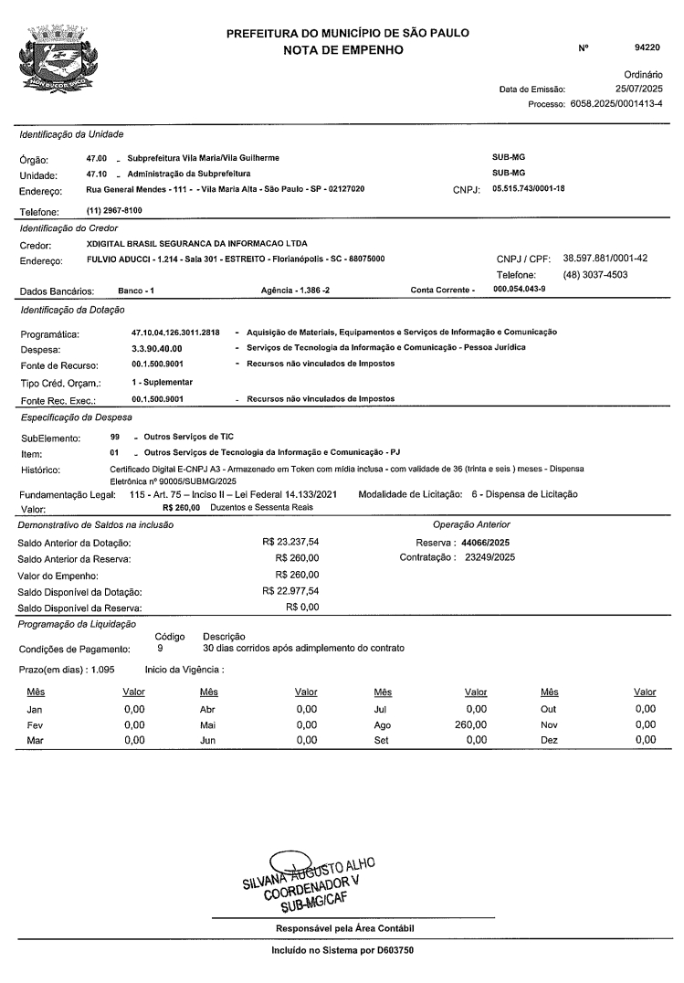 Objeto: Aquisição de Certificado Digital e-CNPJ A3 - Armazenado em Token com midia inclusa - com validade de 12 (doze) meses, para uso do Subprefeito desta Subprefeitura Vila Maria/Vila Guilherme, conforme Especificações Técnicas constantes do Termo de Referência, ANEXO I do Edital.